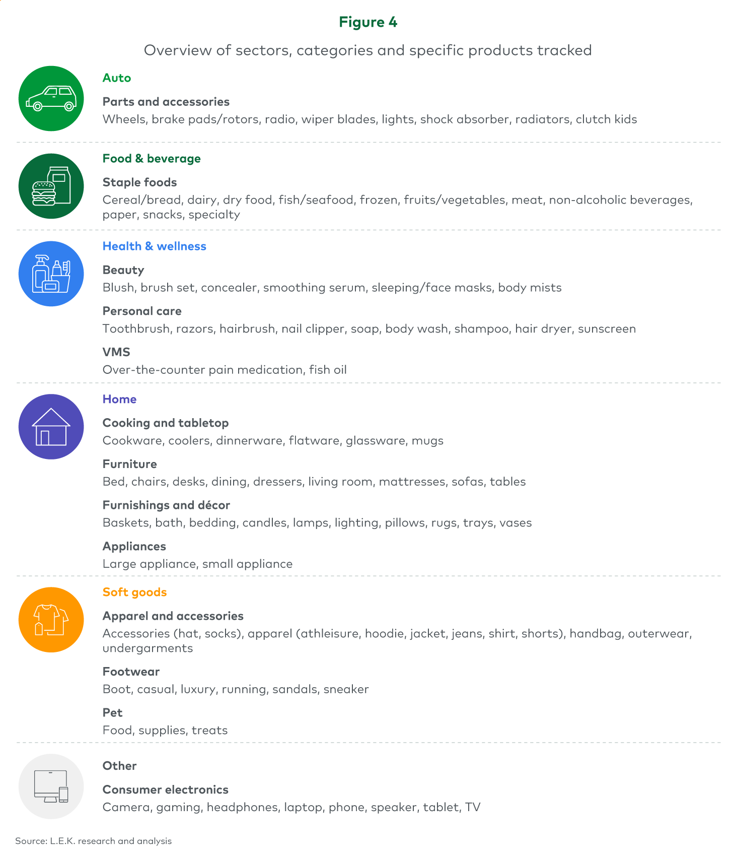 L.E.K. tracked prices for approximately 300 SKUs across six consumer sectors and about 130 retailers. We focused on widely purchased tariff‑exposed or adjacent items to understand how sectors, brands and channels actually adjusted shelf prices as policy uncertainty unfolded (see Figure 4).