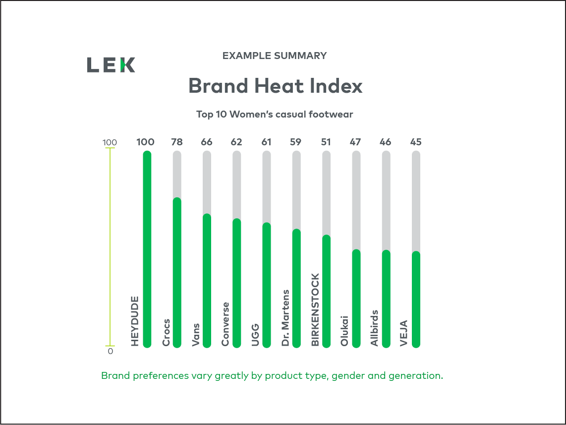 L.E.K. Consulting’s Footwear and Apparel Brand Heat Index, now in its second year, helps brands and retailers identify which brands are gaining popularity across different generations of consumers. In a survey of nearly 4,000 U.S. consumers between the ages of 14 and 55, hundreds of footwear and apparel brands were evaluated by product category (athletic, casual, outdoor and dress), gender and generational cohort, namely, Generation Z, millennials and Generation X. Brands were then assigned a heat score based on their gains in popularity (i.e., their brand heat), expressed on a scale of 0-100. The higher the score, the hotter the brand. It’s important to note that the Brand Heat Index identifies brands on the most positive growth trajectory with shoppers, not necessarily their relative size or scale. Among all the brands evaluated, this report looks at the top 10 brands in each of 16 segments.