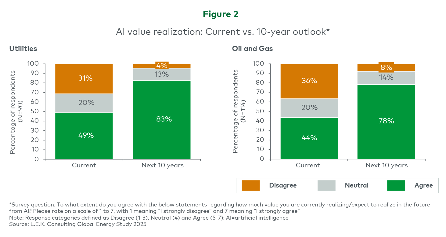 The long-term view is markedly more optimistic than the current assessment. While only 49% of utilities and 44% of O&G respondents believe their organizations are fully realizing AI’s value today, that figure rises to 83% and 78%, respectively, when looking ahead 10 years. This gap highlights a consistent pattern across the sector: Leaders recognize that meaningful value has yet to be captured at scale, but remain confident that the underlying opportunity is substantial (see Figure 2).