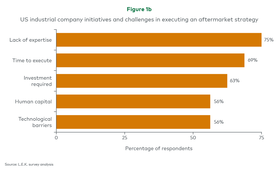 To start, some industrial companies find the expertise required to pursue aftermarket expansion (e.g., pricing strategy, marketing tactics) challenging given the need to balance core business functions with a new add-on service. This is particularly true in today’s environment, where managing tariffs, supply chains and persistent inflation requires a meaningful amount of executive leadership’s attention. Moreover, developing an aftermarket service offering requires investment and time to improve the data collection that will help identify opportunities, and incremental human capital and technology to execute on those opportunities. Add to that channel conflict, which isn’t easy to overcome (see Figures 1a and 1b).